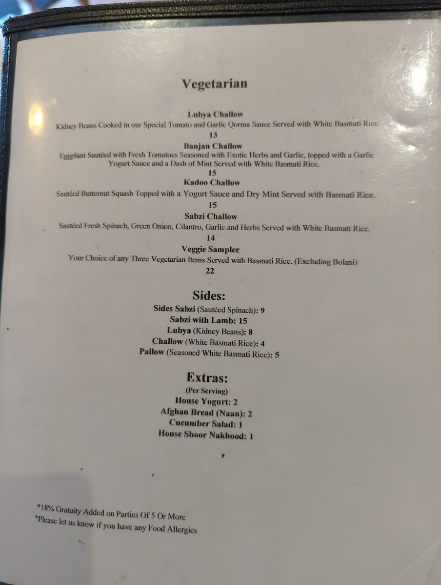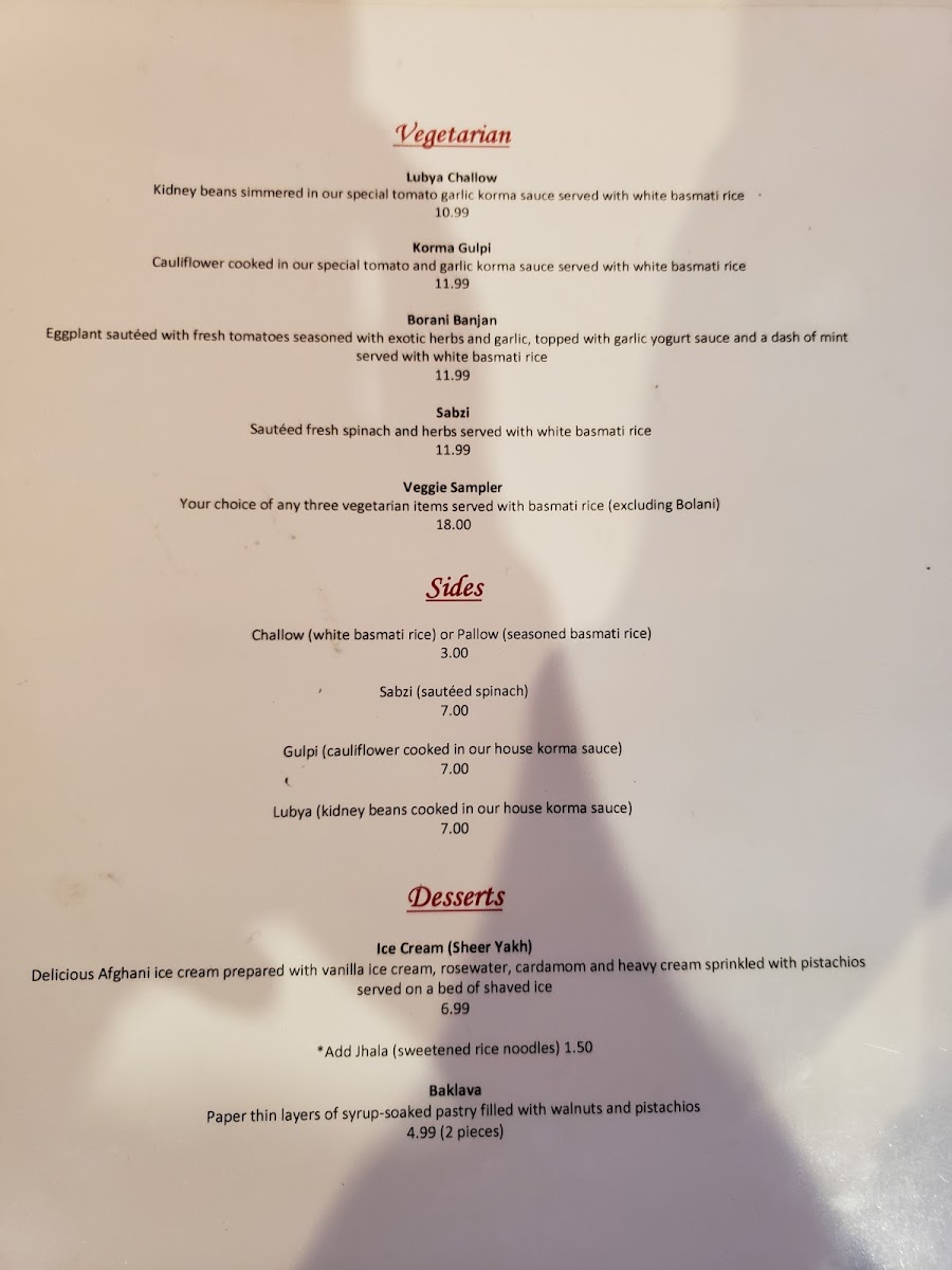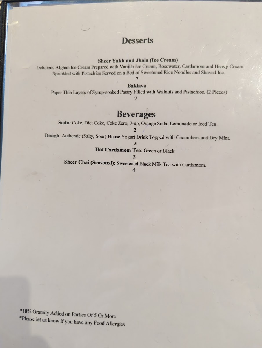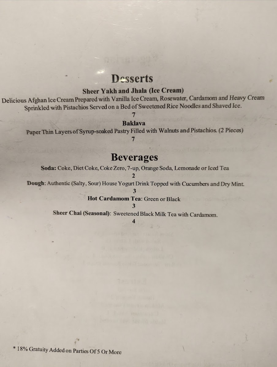 Sides like Chicken Qorma, Pallow, SabziLubya, and Sabzi With Lamb allow guests to customize their meals, and Extras including House Chutney Sauce, House Shoornakhood, House Yogurt Cucumber Salad, and Afghan Bread (Naan) complete the table in a traditional, communal style. Beverage choices-from Dough and Sheer Chai to Hot Cardamom Tea, Soda, and Bottled Sparkling Water-pair naturally with the food, while desserts such as Baklava and Ice Cream (Sheer Yakh & Jhala) provide a satisfying, culturally rooted finish. Overall, the menu feels cohesive and intentional, making De Afghanan a reliable destination for anyone seeking a comprehensive and authentic Afghan dining experience.