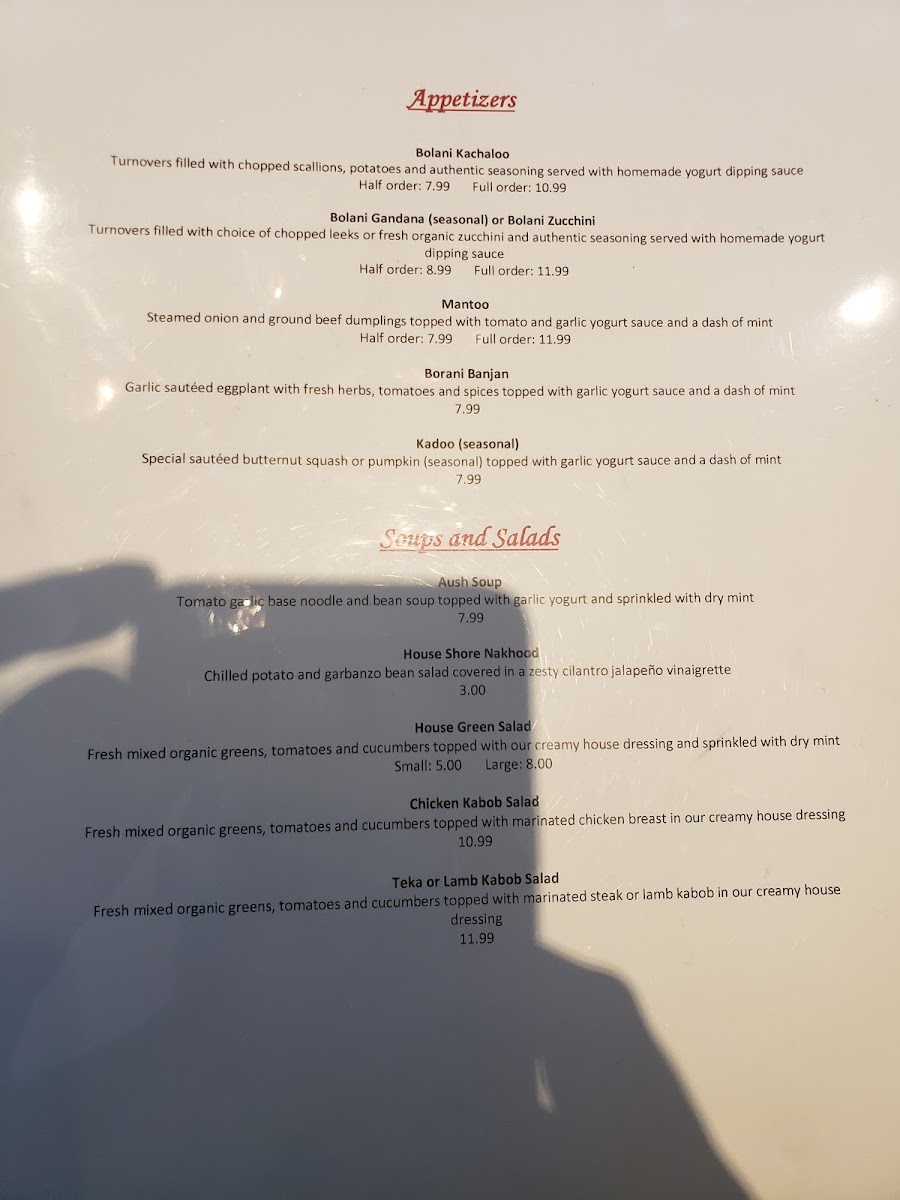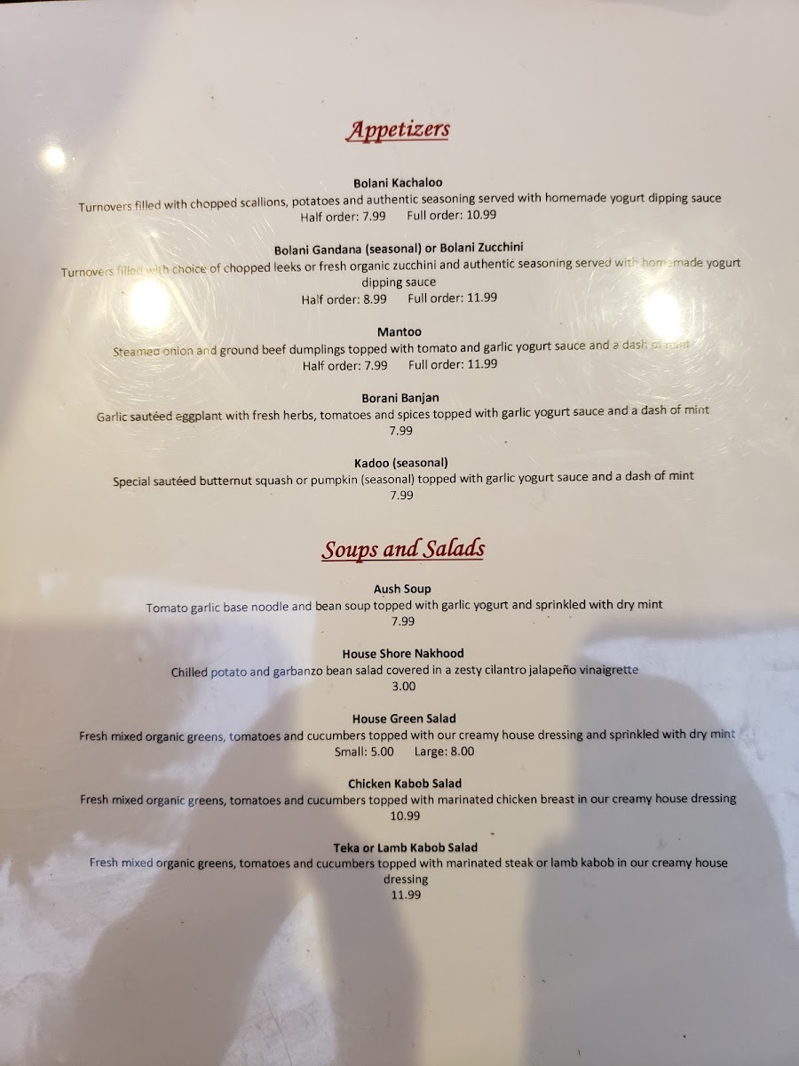 Vegetarian diners are thoughtfully included with comforting rice-based dishes like Borani Kadoo Challow, Lubya Challow, Borani Banjan Challow, and Sabzi Challow, which highlight vegetables and legumes without sacrificing flavor or substance. To start or complement a meal, the Appetizers section-featuring Borani Banjan, Boloni Kachaloo, Bolani Zucchini, Mantoo, and seasonal Borani Kadoo (Seasonal)-adds texture and variety, while Soups and Salads such as Aush Soup, Chicken Kabob Salad, Teka Kabob Salad, and House Green Salad bring freshness and balance.