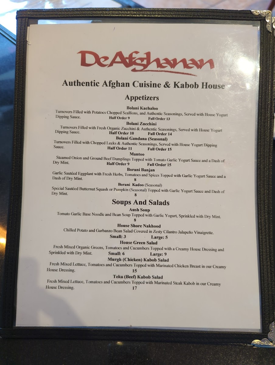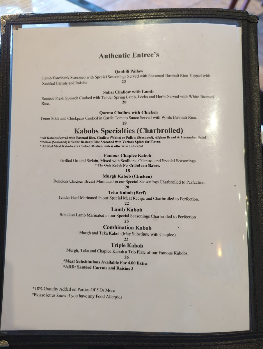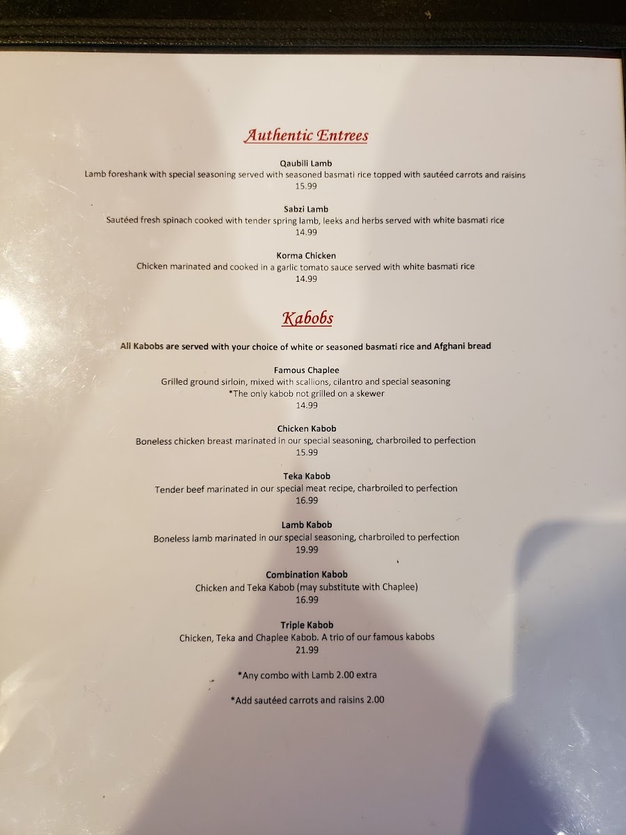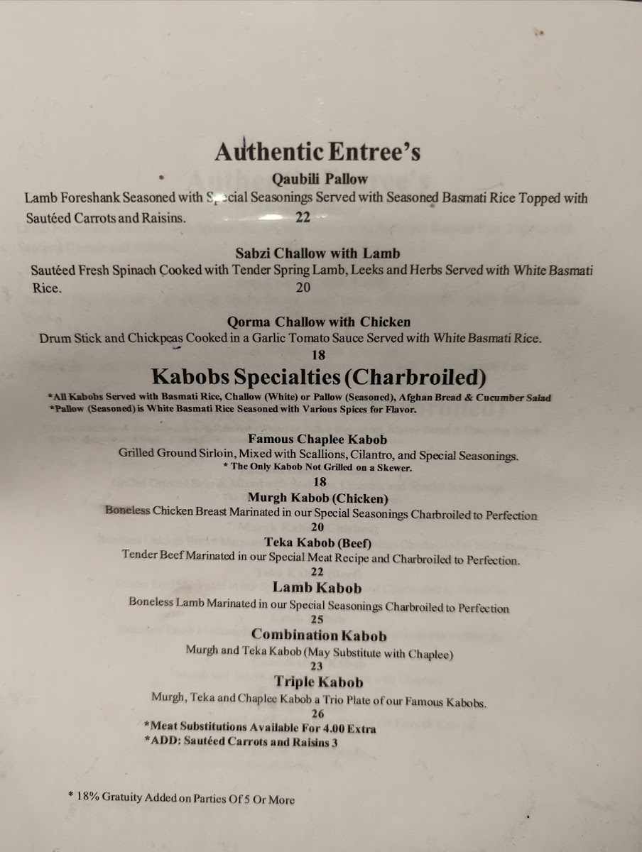 From a reviewer’s perspective, the menu at De Afghanan at 1550 Railroad Ave, Livermore offers a well-rounded and authentic snapshot of Afghan cuisine, balancing tradition, comfort, and variety. The heart of the menu lies in its Authentic Entrée’s, where classics like Qaubili Pallow, Qorma Challow With Chicken, and Sabzi Challow With Lamb showcase slow-cooked flavors, fragrant rice, and richly spiced sauces that immediately signal culinary depth. The Kabobs section further reinforces this identity, with crowd-pleasers such as Lamb Kabob, Famous Chaplee Kabob, Murgh Kabob (Chicken), and hearty options like Combination Kabob and Triple Kabob, ideal for diners who want to sample multiple proteins in one meal.